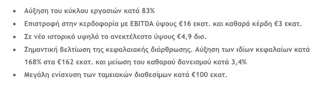 Παράλληλα, o Όμιλος επέστρεψε δυναμικά στην λειτουργική κερδοφορία – μετά από 2 χρόνια – με το ενοποιημένο EBIDTA να διαμορφώνεται στο επίπεδο των €16 εκατ., έναντι ζημιών €3 εκατ. κατά το προηγούμενο οικονομικό έτος. Τα ενοποιημένα μικτά κέρδη ανήλθαν σε €40 εκατ. από €18 εκατ. το 2022, ενισχυμένα κατά 122%, ενώ τα κέρδη μετά φόρων ανήλθαν σε €3 εκατ. από ζημιές €24 εκατ. το 2022.