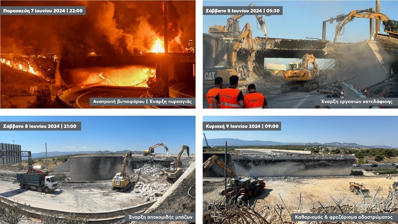 Σημειώνεται ότι η IΝΤΡΑΚΑΤ ανταποκρίθηκε άμεσα σε επείγουσα έκκληση του Υπουργείου Υποδομών & Μεταφορών για την αντιμετώπιση του προβλήματος. Καθ’ όλη τη διάρκεια της νύχτας του Σαββάτου, η εταιρεία μετακίνησε εξειδικευμένα συνεργεία και μηχανήματα έργου στο σημείο και από τις 05.30 π.μ. χθες Σάββατο ξεκίνησε την κατεδάφιση της γέφυρας, η οποία ολοκληρώθηκε σε 12 μόνο ώρες (αργά χθες απόγευμα).
