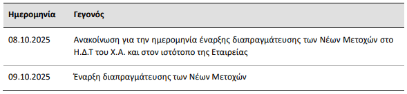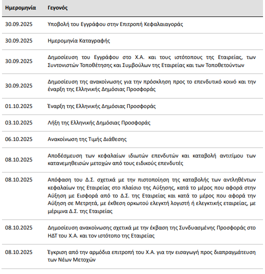 Η περίοδος της Ελληνικής Δημόσιας Προσφοράς θα είναι τρεις (3) εργάσιμες ημέρες, ξεκινώντας την 1η Οκτωβρίου 2025 και λήγοντας στις 3 Οκτωβρίου 2025 στις 16:00, ώρα Ελλάδας. Κατά την ίδια χρονική περίοδο (1η Οκτωβρίου 2025 έως 3 Οκτωβρίου 2025) θα πραγματοποιηθεί και η Θεσμική Προσφορά. Οι υφιστάμενοι μέτοχοι που συμμετέχουν στην Ελληνική Δημόσια Προσφορά θα λάβουν προτεραιότητα στην κατανομή των Προσφερόμενων Μετοχών.