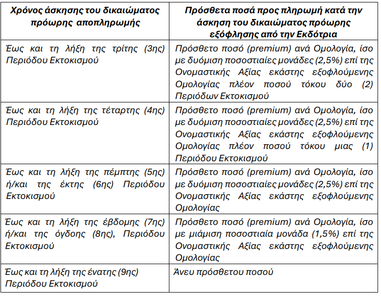 9.3.3. Η πρόωρη αποπληρωμή των Ομολογιών από την Εκδότρια σύμφωνα με τα προαναφερόμενα γίνεται οποτεδήποτε εντός της Περιόδου Εκτοκισμού μαζί με τους δεδουλευμένους τόκους και τα Έξοδα και τους Φόρους και Επιπρόσθετα Ποσά που αναλογούν στις Ομολογίες που αποπληρώνονται και επιπλέον του πρόσθετου ποσού (premium) το οποίο θα διαμορφώνεται ως ακολούθως:
