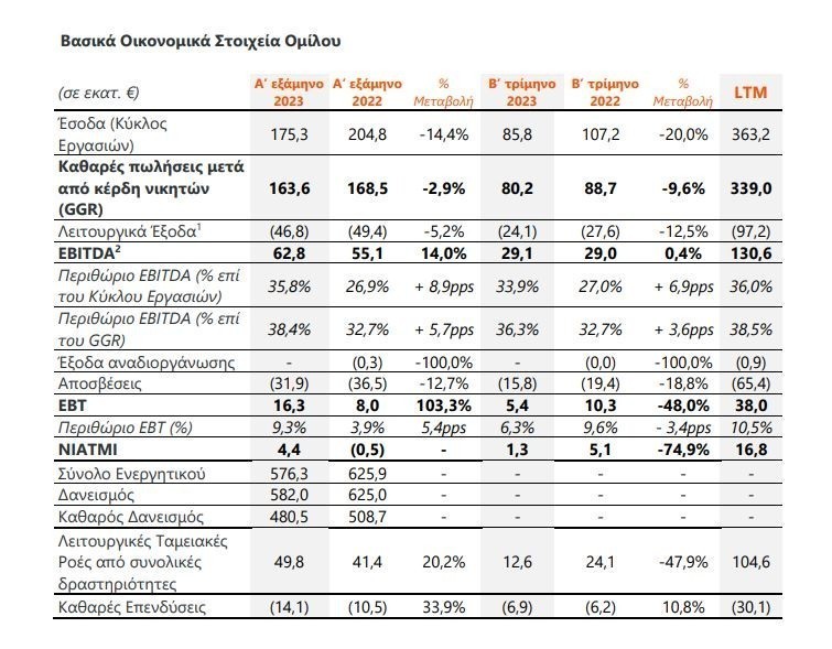 Κατά το Α’ εξάμηνο του 2023, τα έσοδα του Ομίλου διαμορφώθηκαν στα €175,3 εκατ. (-14,4% σε ετήσια βάση).