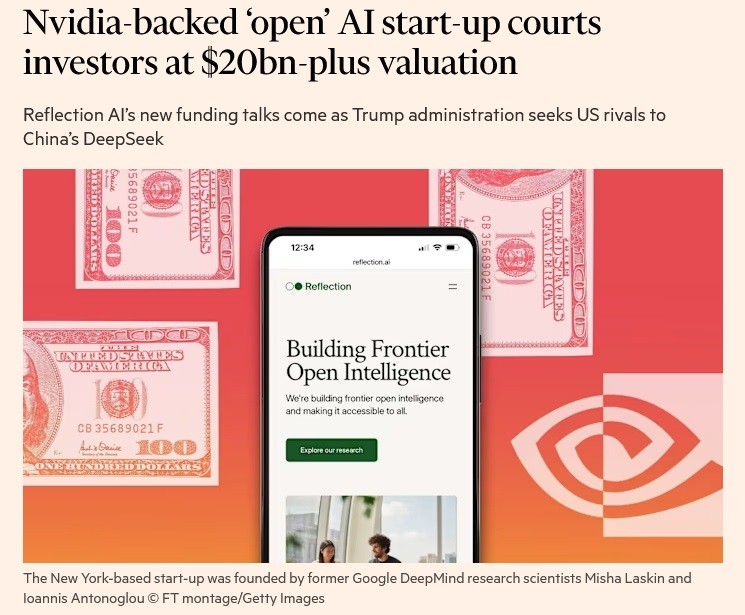Η Reflection AI, η οποία ιδρύθηκε τον Μάρτιο του 2024, με έδρα τις ΗΠΑ και ειδικότερα τη Νέα Υόρκη, άντλησε μόλις τον περασμένο Οκτώβριο (2025) -επισήμως- χρηματοδότηση-μαμούθ ύψους 2 δισ. δολ., σε έναν μόνο γύρο του οποίου ηγήθηκε η Nvidia Corporation και είδε την αποτίμηση της να ανεβαίνει στα 8 δισ. δολ. από… 545 εκατ. δολ. έναν χρόνο νωρίτερα. (συνολικά έχει αντλήσει 2,13 δισ. δολάρια, έως τώρα, από τη «γέννησή» της).