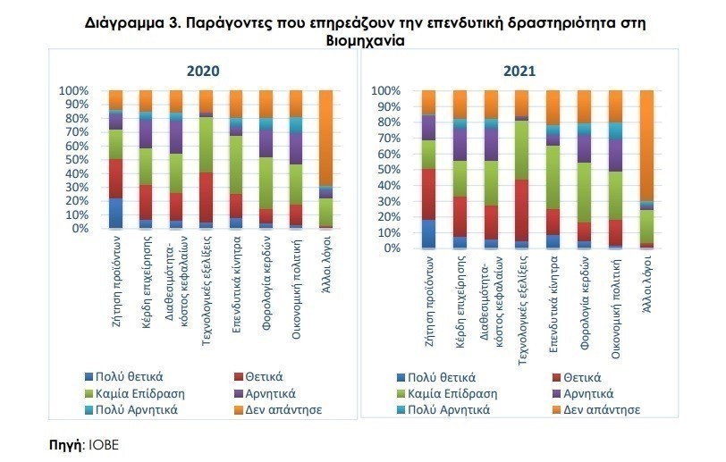 Σύμφωνα με τα αποτελέσματα της τρέχουσας έρευνας, τέσσερις από τους οκτώ εξεταζόμενους παράγοντες εκτιμήθηκε πως επίδρασαν θετικά στην επενδυτική δραστηριότητα των βιομηχανικών επιχειρήσεων κατά το περασμένο έτος. Ο αριθμός τους είναι ελαφρώς αυξημένος το 2021, σε πέντε.