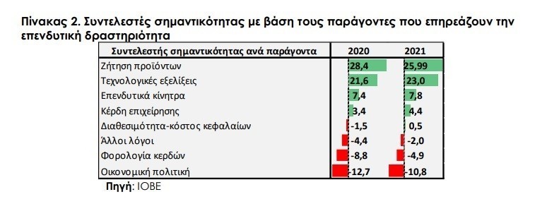 Βάσει των τιμών του συντελεστή σημαντικότητας για τους εξεταζόμενους παράγοντες, για το 2020 αλλά και για φέτος, προέκυψε ότι η προσδοκώμενη ζήτηση για προϊόντα και η συμβολή των τεχνολογικών εξελίξεων είναι οι δύο παράγοντες με την ισχυρότερη θετική επίδραση στις επενδυτικές αποφάσεις. Συγκεκριμένα, το 2020 το 51,0% των ερωτηθέντων αποτίμησε την επίδραση της ζήτησης είτε ως θετική, είτε ως πολύ θετική. Το ίδιο ποσοστό έδωσε τις συγκεκριμένες απαντήσεις για αυτόν τον παράγοντα και για το τρέχον έτος. Η τονωτική συμβολή των τεχνολογικών εξελίξεων είναι σημαντική, αλλά ελαφρώς μικρότερης έντασης από τον προηγούμενο παράγοντα, με ένα 41,2% και 44,1% να την αποτιμά ως θετική ή πολύ θετική για πέρυσι και για το 2021 αντίστοιχα.