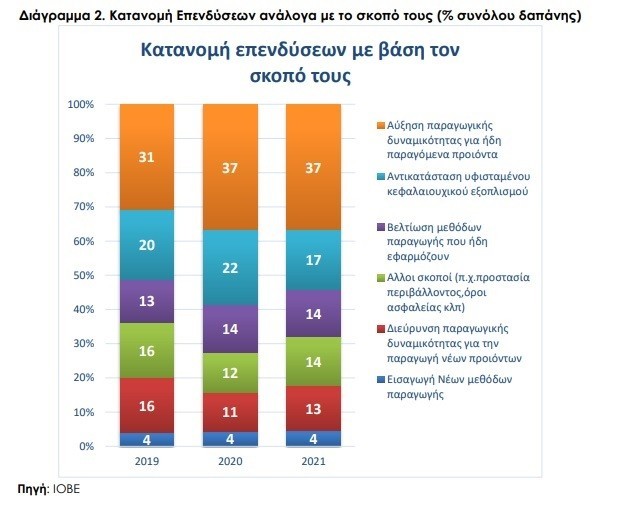 Σύμφωνα με τα αποτελέσματα της πρόσφατης έρευνας, το 2020 το επενδυτικό μείγμα των επιχειρήσεων αποτελούταν πρωτίστως από δαπάνες για αύξηση παραγωγικής δυναμικότητας για ήδη παραγόμενα προϊόντα (37%), ενώ έπονταν οι δαπάνες για αντικατάσταση υφισταμένου κεφαλαιουχικού εξοπλισμού (22%) και για βελτίωση των μεθόδων παραγωγής που ήδη εφαρμόζονται (14%).
