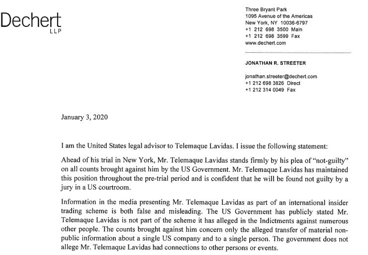 Συγκεκριμένα ο δικηγόρος του Jonathan R. Streeter σε δήλωσή του ενόψει της ακροαματικής διαδικασίας αναφέρει ότι ο πελάτης του είναι αθώος και είναι ψευδές ότι κατηγορείται για συμμετοχή στη διεθνή ομάδα εκμετάλλευσης εμπιστευτικών εταιρικών πληροφοριών (inside information scheme). Όπως αναφέρει ο Τηλέμαχος Λαβίδας αντιμετωπίζει κατηγορίες «που σχετίζονται μόνο με πιθανολογούμενη διαβίβαση εμπιστευτικών πληροφοριών για μία και μόνο αμερικανική εταιρεία προς ένα και μόνο άτομο, χωρίς οι εισαγγελικές αρχές να συνδέουν τον κ. Τηλέμαχο Λαβίδα με κανένα άλλο άτομο ή περιστατικό».