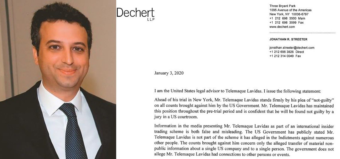 Οι πληροφορίες που αναπαράγονται από τον Τύπο και παρουσιάζουν τον κ. Τηλέμαχο Λαβίδα ως μέλος μιας διεθνούς ομάδας εκμετάλλευσης εμπιστευτικών εταιρικών πληροφοριών (inside information scheme) είναι ψευδείς και παραπλανητικές. Όπως έχουν δηλώσει δημοσίως και οι Αμερικανοί εισαγγελείς, ο κ. Τηλέμαχος Λαβίδας ουδέποτε υπήρξε μέλος της εν λόγω ομάδας όπως αυτή περιγράφεται στις ξεχωριστές διώξεις που έχουν ασκηθεί εναντίον άλλων ατόμων. Οι κατηγορίες που αντιμετωπίζει σχετίζονται μόνο με πιθανολογούμενη διαβίβαση εμπιστευτικών πληροφοριών για μία και μόνο αμερικανική εταιρεία προς ένα και μόνο άτομο. Οι εισαγγελικές αρχές δεν συνδέουν τον κ. Τηλέμαχο Λαβίδα με κανένα άλλο άτομο ή περιστατικό.