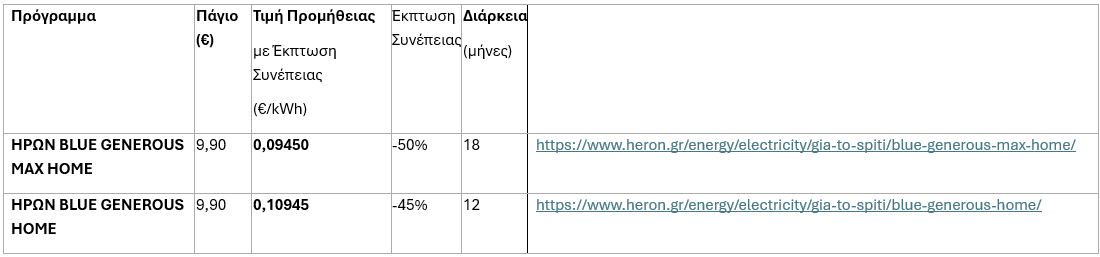 Οι ανταγωνιστικές τιμές των σταθερών οικιακών προγραμμάτων HΡΩΝ ΒLUE GENEROUS, με το 18μηνο συμβόλαιο ΗΡΩΝ BLUE GENEROUS MAX να παραμένει κάτω από τα 9,5 λεπτά την κιλοβατώρα, εξασφαλίζοντας χαμηλή & σταθερή τιμή ως και την επόμενη άνοιξη.