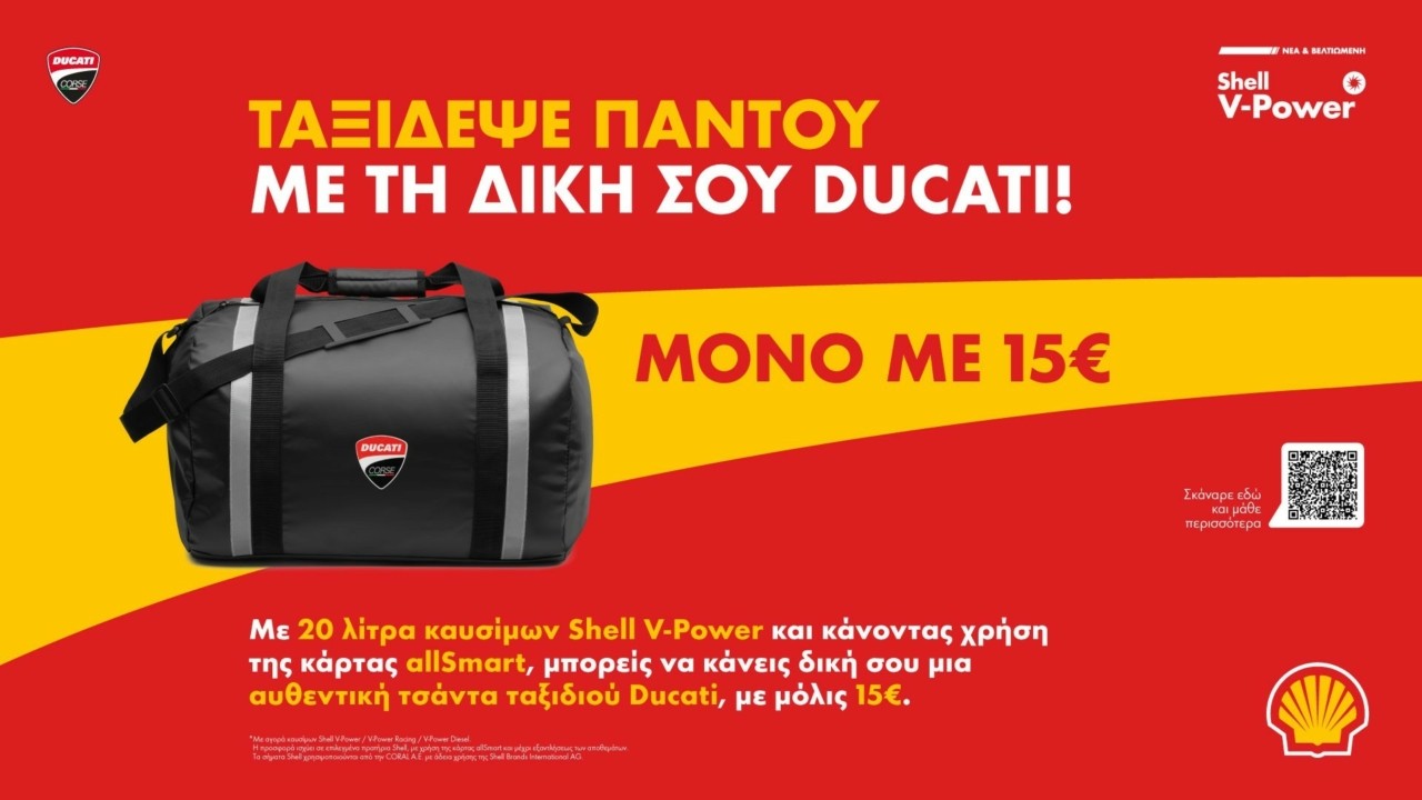 Αυτή η ειδική προσφορά είναι διαθέσιμη έως εξάντλησης των αποθεμάτων σε όλα τα πρατήρια Shell στην Ελλάδα. Ανεφοδιάζοντας με τα υψηλής ποιότητας καύσιμα V-Power της Shell, οι πελάτες όχι μόνο βελτιστοποιούν την απόδοση του οχήματός τους, αλλά έχουν επίσης την ευκαιρία να αποκτήσουν μια αυθεντική τσάντα ταξιδιού Ducati σε πολύ προσιτή τιμή.