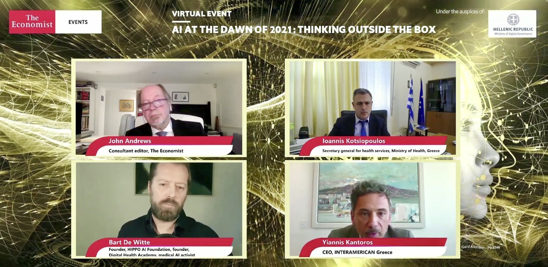 Στο ιδιαίτερα σημαντικό Συνέδριο που οργάνωσε στις 29 Ιανουαρίου ο Economist, με θέμα «Artificial Intelligence at the Dawn of 2021: Thinking outside the box», συμμετείχε ως συνομιλητής σε πάνελ ο Γιάννης Καντώρος, Διευθύνων Σύμβουλος της INTERAMERICAN, ειδικότερα για την εφαρμογή της τεχνητής νοημοσύνης στον τομέα της Υγείας («Artificial Intelligence in Health»). Στο πάνελ, στο οποίο συμμετείχαν ακόμη ο Γιάννης Κωτσιόπουλος, Γενικός Γραμματέας του Υπουργείου Υγείας και ο Bart De Witte, founder (HIPPO AI Foundation, Digital Health Academy, Medical AI), συζητήθηκαν οι εφαρμογές και οι νέες θεραπείες που υπόσχεται η τεχνητή νοημοσύνη. Επίσης, οι συνομιλητές τοποθετήθηκαν για την αξιοπιστία των λύσεων Artificial Intelligence.