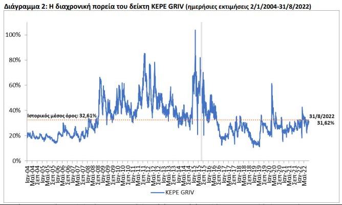 Ο δείκτης τεκμαρτής μεταβλητότητας αποτυπώνει την αβεβαιότητα των συμμετεχόντων στην αγορά παραγώγων για την αναμενόμενη βραχυπρόθεσμη πορεία της ελληνικής αγοράς και υπολογίζεται στη βάση των τιμών των δικαιωμάτων προαίρεσης του δείκτη FTSE/X.A. Large Cap. Η τιμή του δείκτη KEPE GRIV τον Αύγουστο του 2022 έφτασε το 31,62% στις 31/8/2022 από 28,19% στις 29/7/2022. Επιπλέον, η μέση ημερήσια τιμή του δείκτη αυξήθηκε τον Αύγουστο του 2022 φτάνοντας το 31,16% από 26,93% τον Ιούλιο του 2022. Ο δείκτης παρέμεινε σε επίπεδα χαμηλότερα του ιστορικού μέσου όρου του (από τον Ιανουάριο του 2004) για την ελληνική αγορά, ο οποίος είναι στο 32,61%.