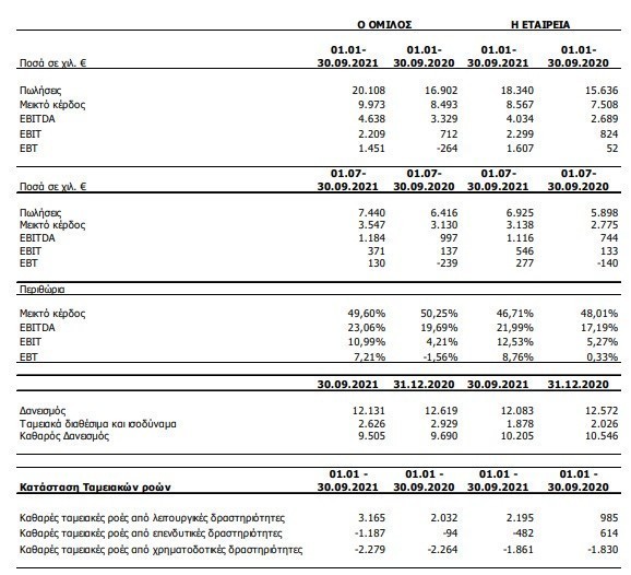 Ο κύκλος εργασιών της μητρικής Εταιρείας ανήλθε σε € 18.340 χιλ. έναντι € 15.636 χιλ. αυξημένος κατά 17,29% σε σχέση με το ενιάμηνο του 2020. Τα μικτά κέρδη ανήλθαν σε €8.567 χιλ. έναντι € 7.508 χιλ. το ενιάμηνο του 2020, σημειώνοντας αύξηση κατά 14,11%.Τα αποτελέσματα προ φόρων τόκων και αποσβέσεων (EBITDA) ανήλθαν σε εταιρικό επίπεδο σε €4.034 χιλ. έναντι € 2.689 χιλ. το ενιάμηνο του 2020 σημειώνοντας αύξηση κατά 50,03%.Τα