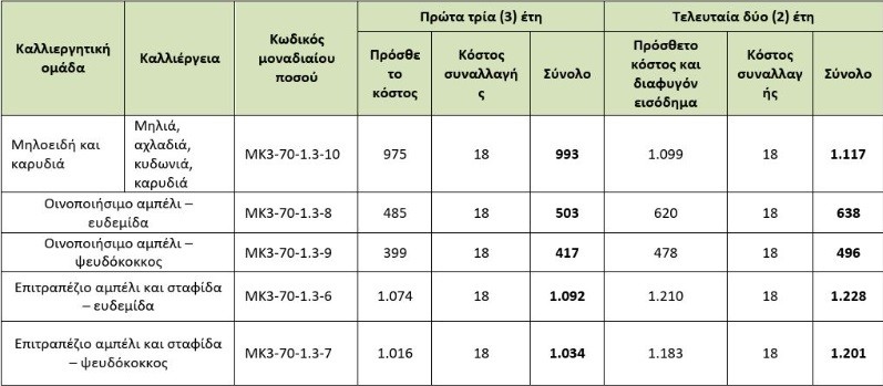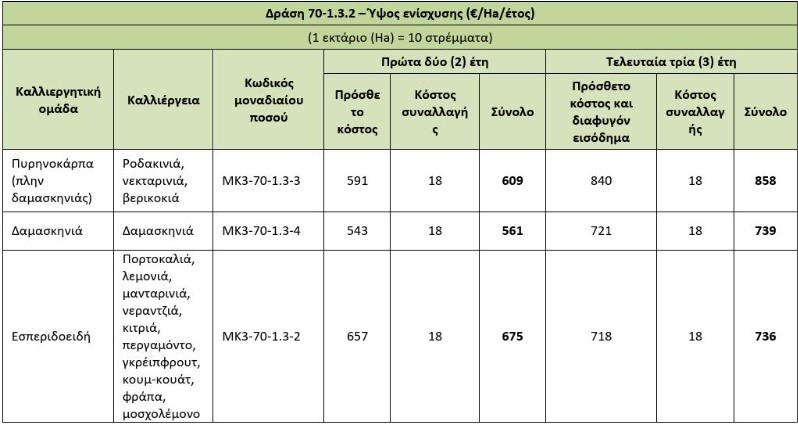 Η πρόσκληση, συνολικού ύψους 60 εκατ. ευρώ, αφορά τις καλλιέργειες της ροδακινιάς, της νεκταρινιάς, της βερικοκιάς, της μηλιάς, της αχλαδιάς, της κυδωνιάς, της καρυδιάς, της δαμασκηνιάς, των εσπεριδοειδών (πορτοκαλιά, λεμονιά, μανταρινιά, νεραντζιά, κιτριά, περγαμόντο, γκρέιπφρουτ, κουμ-κουάτ, φράπα, μοσχολέμονο) και της αμπέλου (οινοποιήσιμο, επιτραπέζιο, σταφίδα).