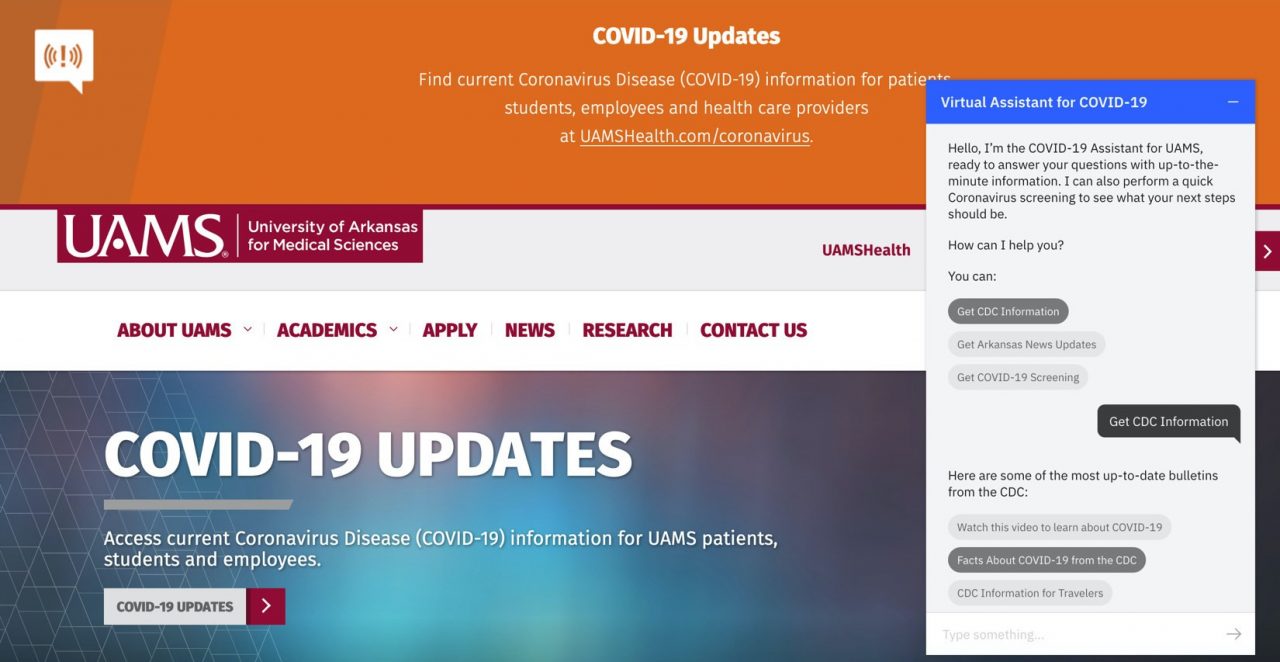 · ΗΠΑ, Ιατρικό Κέντρο του Πανεπιστημίου του Αρκάνσας– Μέσα σε 9 ημέρες υλοποιήθηκε εικονικός βοηθός για άμεσες απαντήσεις προς τους πολίτες σχετικά με διαγνωστικά τεστ, συμπτώματα και διαθέσιμες υποδομές ενώ οι πληροφορίες αποστέλλονται αυτόματα, ηλεκτρονικά σε ένα κινητό κέντρο αξιολόγησης και προτεραιοποίησης για την επιτάχυνση της απόκρισης.