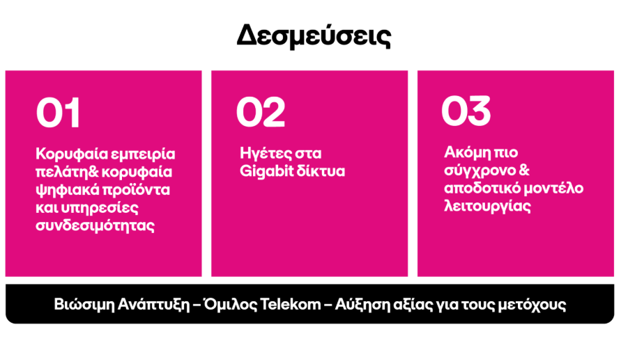 Αναφορικά με τον Μετασχηματισμό, το δεύτερο πυλώνα του Σχεδίου, την περαιτέρω ενίσχυση των ψηφιακών καναλιών για πωλήσεις και εξυπηρέτηση πελατών και την επιτάχυνση του μετασχηματισμού του λειτουργικού και παραγωγικού μοντέλου, αξιοποιώντας εργαλεία Τεχνητής Νοημοσύνης, τεχνολογίες cloud και αυτοματισμούς. Τέλος, για τον τρίτο πυλώνα (Διαφοροποίηση), στόχος είναι η βελτίωση των δεικτών εμπειρίας πελάτη και η αξιοποίηση του brand «T» του μητρικού ομίλου Τelekom αλλά και να βρεθεί στους κορυφαίους εργοδότες στην Ελλάδα.