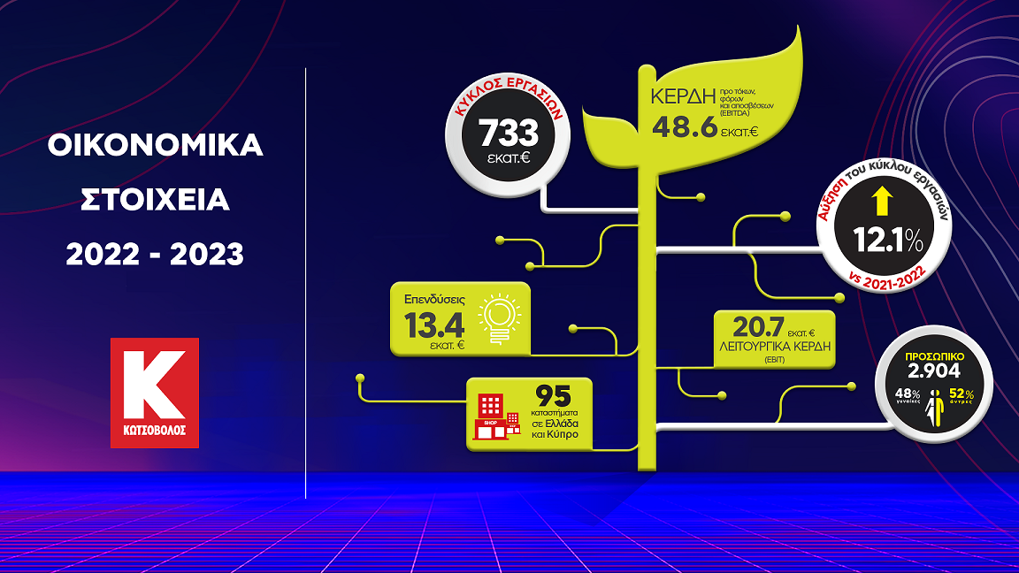 Συγκεκριμένα, ο κύκλος εργασιών έκλεισε στα 733 εκατ. ευρώ, σημειώνοντας αύξηση της τάξης του 12,1% σε σχέση με το οικονομικό έτος 2021-2022. Tα κέρδη προ τόκων, φόρων και αποσβέσεων (EBITDA) έφτασαν τα 48.6 εκατ. ευρώ από 51,7 εκατ. ευρώ το προηγούμενο έτος.