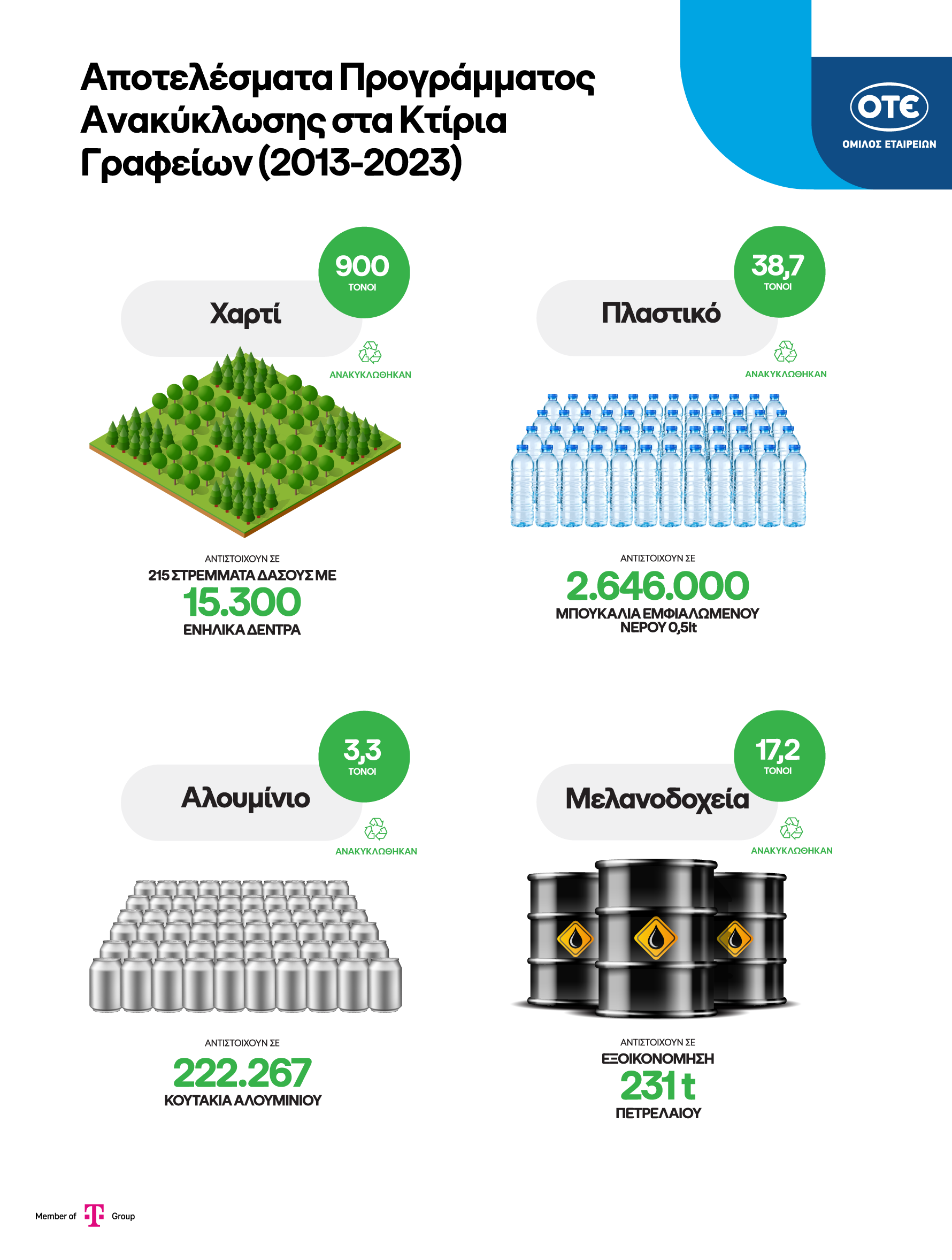 Σύμφωνα με την εταιρική ανακοίνωση, πρόκειται για το πρώτο πρόγραμμα ανακύκλωσης σε χώρο γραφείων στην Ελλάδα που εφάρμοσε την αρχή του διαχωρισμού των υλικών στην πηγή, με τη συλλογή τους σε διαφορετικούς κάδους (διακριτοί κάδοι για χαρτί, συσκευασίες ανά υλικό – πλαστικό, αλουμίνιο, γυαλί, λοιπές συσκευασίες, μελάνια, τηλέφωνα, μικρές ηλεκτρικές και ηλεκτρονικές συσκευές και μπαταρίες). Το πρόγραμμα υλοποιείται από το 2013 σε 24 κτίρια γραφείων του Ομίλου σε όλη τη χώρα, που στεγάζουν 9.000 εργαζόμενους.
