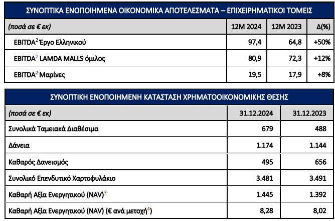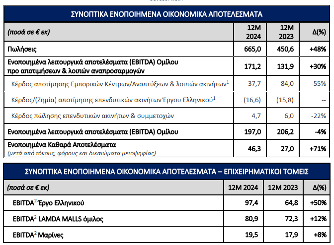 Νέο ιστορικό ρεκόρ EBITDA για τις Μαρίνες στα €19εκ, αυξημένα 8% έναντι του 2023 και 50% αύξηση του EBITDA προ αποτιμήσεων για το Έργο Ελληνικού (The Ellinikon) στα €97εκ. Επίσης €589εκ συνολικές εισπράξεις από πωλήσεις ακινήτων για το Έργο Ελληνικού το 2024 αυξημένες 84% έναντι του 2023, με τις συνολικές εισπράξεις να ξεπερνούν τα €1,1 δις από την έναρξη του έργου μέχρι την 28.02.2025.