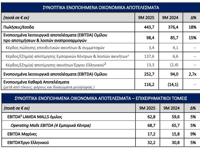 Η LAMDA Development S.A. ανακοίνωσε ισχυρές επιδόσεις για το εννεάμηνο 2025, με τα ενοποιημένα κέρδη EBITDA του Ομίλου να αυξάνονται κατά 2,7 φορές, φτάνοντας τα €253 εκατ., σε σχέση με το εννεάμηνο 2024. Τα ενοποιημένα καθαρά αποτελέσματα διαμορφώθηκαν στα €116 εκατ., έναντι ζημιών την αντίστοιχη περίοδο του 2024, ενώ η συνολική αξία του επενδυτικού χαρτοφυλακίου του Ομίλου αποτιμάται πλέον στα €3,7 δισ.