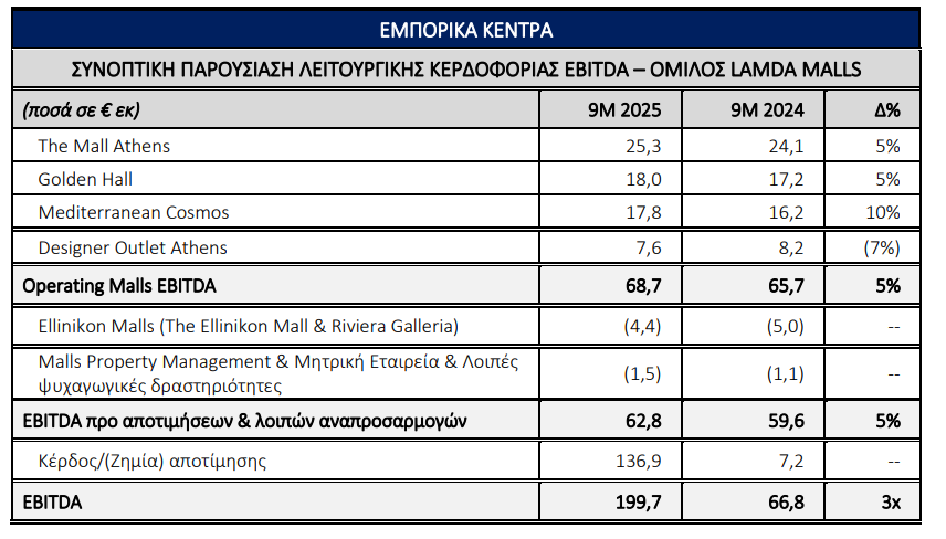 Τα 4 Εμπορικά Κέντρα σε λειτουργία, σημείωσαν για μια ακόμα περίοδο, νέο ιστορικό υψηλό operating EBITDA στα €68,7 εκατ. στο Εννεάμηνο 2025, κυρίως λόγω της αύξησης των βασικών μισθωμάτων κατά 5% έναντι της αντίστοιχης περιόδου το 2024 και της αύξησης των εσόδων στάθμευσης κατά 10% για την ίδια περίοδο. Τα αποτελέσματα υποστηρίχθηκαν από τη συνεχιζόμενη αύξηση της επισκεψιμότητας (αύξηση 2% έναντι της αντίστοιχης περιόδου το 2024), καθώς και την επίτευξη νέου ρεκόρ στο συνολικό κύκλο εργασιών των καταστημάτων στα €620 εκατ.