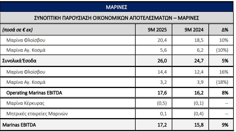 Οι Μαρίνες επιβεβαίωσαν για μια ακόμα περίοδο τη σταθερά αυξητική πορεία των μεγεθών τους, επιτυγχάνοντας νέο ιστορικό ρεκόρ για το Εννεάμηνο τόσο στα συνολικά έσοδα, τα οποία ανήλθαν στα €26 εκατ. (αύξηση 5% έναντι της αντίστοιχης περιόδου το 2024) όσο και στα κέρδη EBITDA, τα οποία αυξήθηκαν 9%, έναντι της αντίστοιχης περιόδου το 2024, στα €17,2 εκατ.
