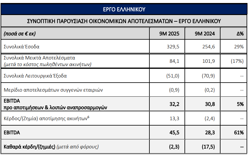 Για το Ελληνικό, τα κέρδη EBITDA προ αποτιμήσεων ανήλθαν στα €32,2 εκατ., αυξημένα κατά 5% έναντι του εννεάμηνου 2024. Οι συνολικές εισπράξεις από πωλήσεις ακινήτων για το έργο The Ellinikon ανέρχονται σε €1,5 δισ. από την έναρξη του έργου έως τις 30.11.2025, με το 84% από τις 671 κατοικίες του Little Athens να έχουν ήδη πωληθεί ή δεσμευθεί.