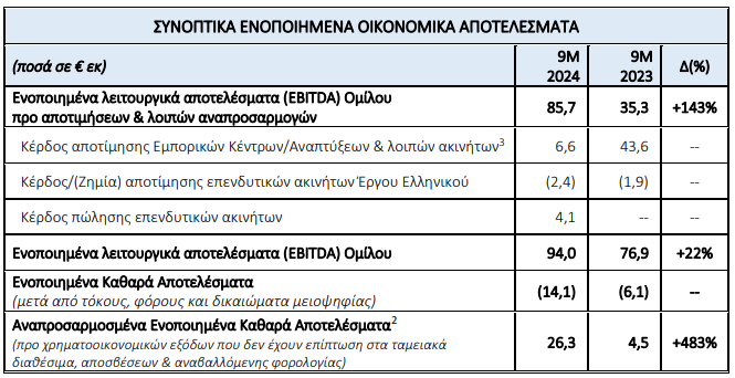 Σημαντική ενίσχυση κερδοφορίας EBITDA για το Έργο Ελληνικού (The Ellinikon) στα €31 εκατ, μαζί με σχεδόν €1 δισ. εισπράξεις από πωλήσεις ακινήτων από την έναρξη του έργου μέχρι 31.10.2024, ξεπερνώντας ήδη το στόχο που είχε τεθεί για το τέλος του 2024. Ακόμα αύξηση 483% έναντι του 2023 στα Αναπροσαρμοσμένα Καθαρά Αποτελέσματα στα €26 εκατ. ενώ τα συνολικά κέρδη προ-φόρων ανήλθαν σε €173 εκατ. (€0,98 ανά μετοχή) από τις 3 πρόσφατες συναλλαγές πωλήσεων οικοπέδων στο Έργο του Ελληνικού, εκ των οποίων μόλις €39 εκατ. έχουν αναγνωριστεί μέχρι σήμερα.