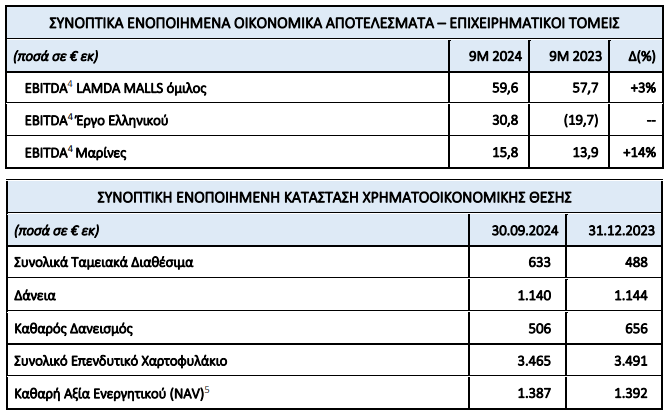 Εξαιρετικές οικονομικές επιδόσεις παρουσίασε η Lamda Development στα οικονομικά αποτελέσματα για το εννεάμηνο του 2024. Ειδικότερα ανακοίνωσε αύξηση 155% στα ενοποιημένα κέρδη EBITDA προ αποτιμήσεων στα €89,8 εκατ. Ταυτόχρονα ανακοίνωσε νέο ιστορικό ρεκόρ κερδών Retail EBITDA (Εμπορικά Κέντρα σε λειτουργία) προ αποτιμήσεων στα €66 εκατ., αυξημένα 7% έναντι του 2023 αλλά και νέο ιστορικό ρεκόρ κερδών EBITDA για τις Μαρίνες στα €16 εκατ., αυξημένα 14% έναντι του 2023.