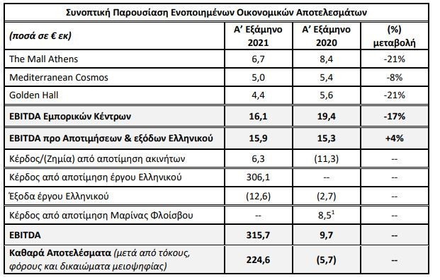 Τα κέρδη EBITDA των Εμπορικών Κέντρων The Mall Athens, Golden Hall και Mediterranean Cosmos ανήλθαν σε €16,1εκ, μειωμένα κατά 17% έναντι της αντίστοιχης περιόδου το 2020, λόγω της αναστολής λειτουργίας τους κατά το μεγαλύτερο διάστημα2 της περιόδου, της νομοθετικά προβλεπόμενης παροχής μειώσεων στα μισθώματα των καταστηματαρχών/μισθωτών καθώς και των περιοριστικών μέτρων στη λειτουργία τους που ελήφθησαν για την αντιμετώπιση της εξάπλωσης της πανδημίας.
