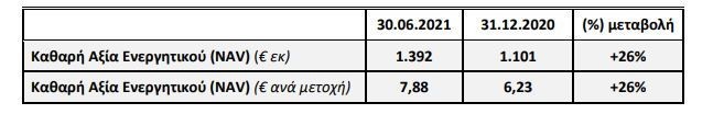 Η Καθαρή Αξία Ενεργητικού (NAV) της Εταιρείας την 30.06.2021 ανήλθε σε €1.392εκ (ήτοι €7,88 ανά μετοχή), αυξημένη κατά 26% έναντι της 31.12.2020. Η θετική επίπτωση στην Καθαρή Αξία Ενεργητικού (NAV) που προέκυψε από την επανεκτίμηση της αξίας μέρους του ενεργητικού (Επενδυτικά Ακίνητα) της ΕΛΛΗΝΙΚΟ Α.Ε. ανήλθε σε €306εκ. Στην κατηγορία των επενδυτικών ακινήτων του Έργου Ελληνικού περιλαμβάνονται τα Εμπορικά Κέντρα και οι λοιπές εμπορικές χρήσεις, τα γραφεία, το ολοκληρωμένο τουριστικό θέρετρο-καζίνο, καθώς και οι χρήσεις σχετικά με τον αθλητισμό και τα σχολεία. Αντίθετα, οι υπεραξίες που θα προκύψουν από τις οικιστικές αναπτύξεις θα παρουσιάζονται στα αποτελέσματα μετά την υπογραφή της συμφωνίας πώλησης και της έναρξης της κατασκευής τους.