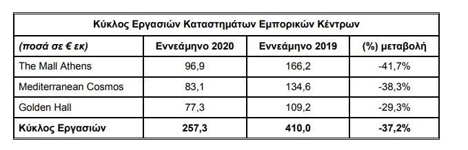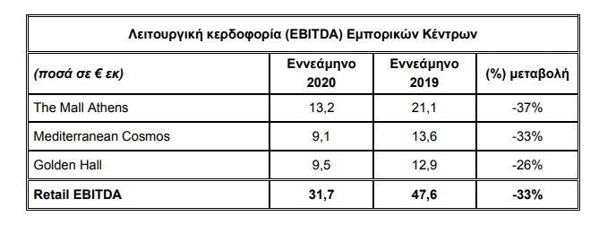 Η αναστολή λειτουργίας των Εμπορικών Κέντρων, βάσει κυβερνητικής απόφασης, κατά την περίοδο 13.03.2020 έως 17.05.2020, καθώς και των πρόσθετων περιοριστικών μέτρων που ελήφθησαν για την αντιμετώπιση της εξάπλωσης της, είχαν ως συνέπεια τη μείωση της λειτουργικής κερδοφορίας τους (EBITDA) κατά 33% έναντι της αντίστοιχης περιόδου το 2019 στα €31,7εκ.