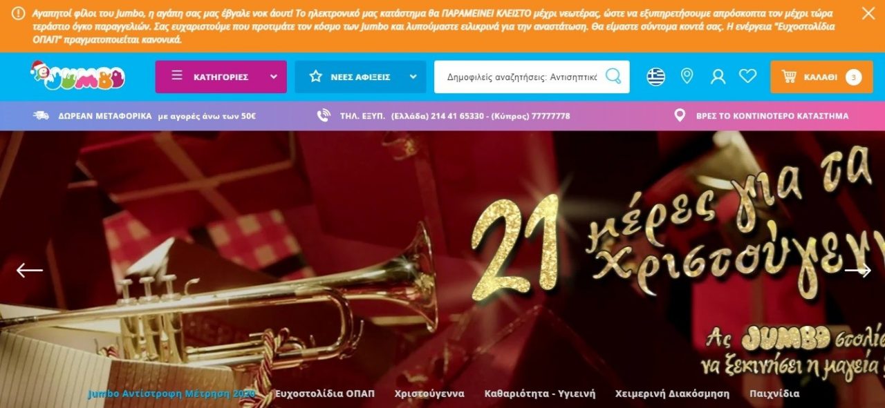 «Αγαπητοί φίλοι του Jumbo, η αγάπη σας μας έβγαλε νοκ άουτ! Το ηλεκτρονικό μας κατάστημα θα ΠΑΡΑΜΕΙΝΕΙ ΚΛΕΙΣΤΟ μέχρι νεωτέρας, ώστε να εξυπηρετήσουμε απρόσκοπτα τον μέχρι τώρα τεράστιο όγκο παραγγελιών. Σας ευχαριστούμε που προτιμάτε τον κόσμο των Jumbo και λυπούμαστε ειλικρινά για την αναστάτωση. Θα είμαστε σύντομα κοντά σας. Η ενέργεια “Ευχοστολίδια ΟΠΑΠ” πραγματοποιείται κανονικά».