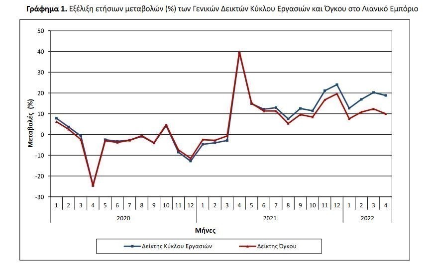 Την ίδια ώρα, ο Γενικός Δείκτης Όγκου (κύκλος εργασιών σε σταθερές τιμές), κατά τον μήνα Απρίλιο 2022, σε σύγκριση με τον αντίστοιχο δείκτη του Απριλίου 2021, παρουσίασε αύξηση 10,0% και σε σύγκριση με τον αντίστοιχο δείκτη του Μαρτίου 2022 αύξηση 6,3%.