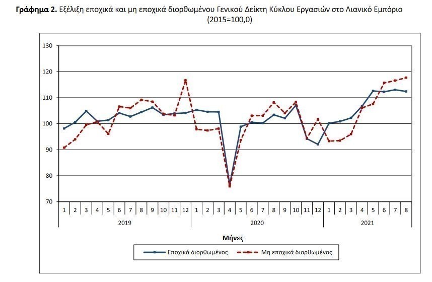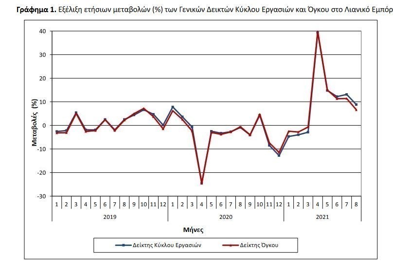 Ο Γενικός Δείκτης Όγκου (κύκλος εργασιών σε σταθερές τιμές), κατά τον μήνα Αύγουστο 2021, σε σύγκριση με τον αντίστοιχο δείκτη του Αυγούστου 2020, παρουσίασε αύξηση 6,6% και σε σύγκριση με τον αντίστοιχο δείκτη του Ιουλίου 2021 αύξηση 1,2%.