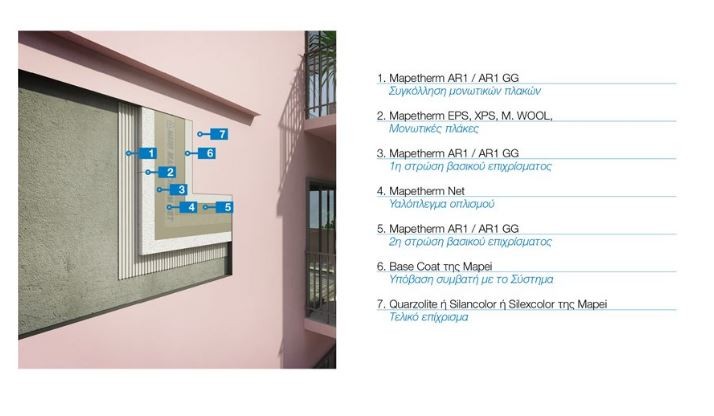 Το Mapetherm System αποτελεί ένα εξελιγμένο τεχνολογικά σύστημα εξωτερικής θερμομόνωσης με τη δυνατότητα επιλογής ανάμεσα σε διαφόρους τύπους μονωτικών (ΕPS, EPS plus, πετροβάμβακας, XPS) και πληθώρα τελικών επιχρισμάτων σε πολλές κοκκομετρίες και διευρυμένο χρωματολόγιο για όλες τις απαιτήσεις. Δοκιμασμένα για τις έντονες συνθήκες της ελληνικής επικράτειας, αποτελούν προϊόντα με την τεχνογνωσία των εργαστηρίων Έρευνας & Ανάπτυξης της Mapei και την αξιοπιστία των 80 και πλέον χρόνων της στην παραγωγή καινοτόμων προϊόντων υψηλής ποιότητας.