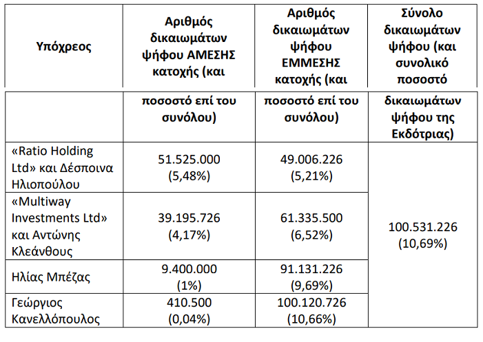 Στοιχεία υπόχρεων: «Ratio Holding Ltd», Δέσποινα Ηλιοπούλου, «Multiway Investments Ltd», Αντώνης Κλεάνθους, Ηλίας Μπέζας, Γεώργιος Κανελλόπουλος