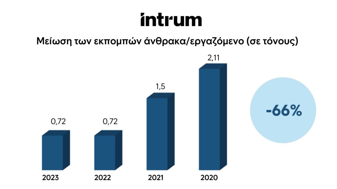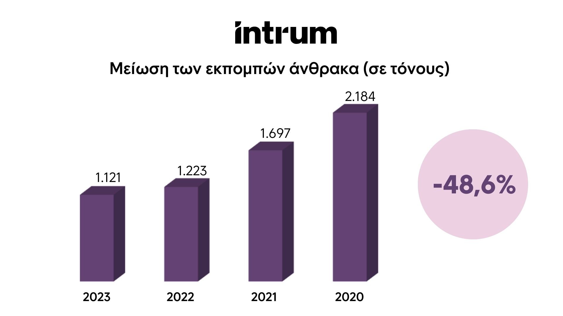 • Μείωση των εκπομπών άνθρακα κατά 48,6% από το 2020, δηλαδή σε 1.121 τόνους το 2023 από 2.184 τόνους το 2020. Ο αντίστοιχος μέσος όρος μείωσης στο σύνολο των χωρών του Ομίλου Intrum είναι 15%.