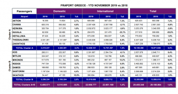 Ειδικότερα, για το διάστημα Ιανουαρίου- Νοεμβρίου του 2019, το σύνολο της επιβατικής κίνησης για τα 14 αεροδρόμια (Ακτιο, Χανιά, Κέρκυρα, Καβάλα, Κεφαλονιά, Θεσσαλονίκη, Ζάκυνθος, Κώς, Μυτιλήνη, Μύκονος, Ρόδος, Σάμος, Σαντορίνη, Σκιάθος) έφθασε τα 29,45 εκατ. από 29,16 εκατ. το αντίστοιχο διάστημα πέρυσι, σημειώνοντας αύξηση κατά 1%. Το μεγαλύτερο όγκο επιβατών παρουσιάζει, όπως είναι εύλογο το αεροδρόμιο της Θεσσαλονίκης με 6,45 εκατ. στο εντεκάμηνο (+3,3% σε σύγκριση με το εντεκάμηνο του 2018), ενώ τη μεγαλύτερη αύξηση το αεροδρόμιο της Μυκόνου με άνοδο κατά την ίδια περίοδο της τάξεως του 9% στο 1,5 εκατ. επιβάτες.