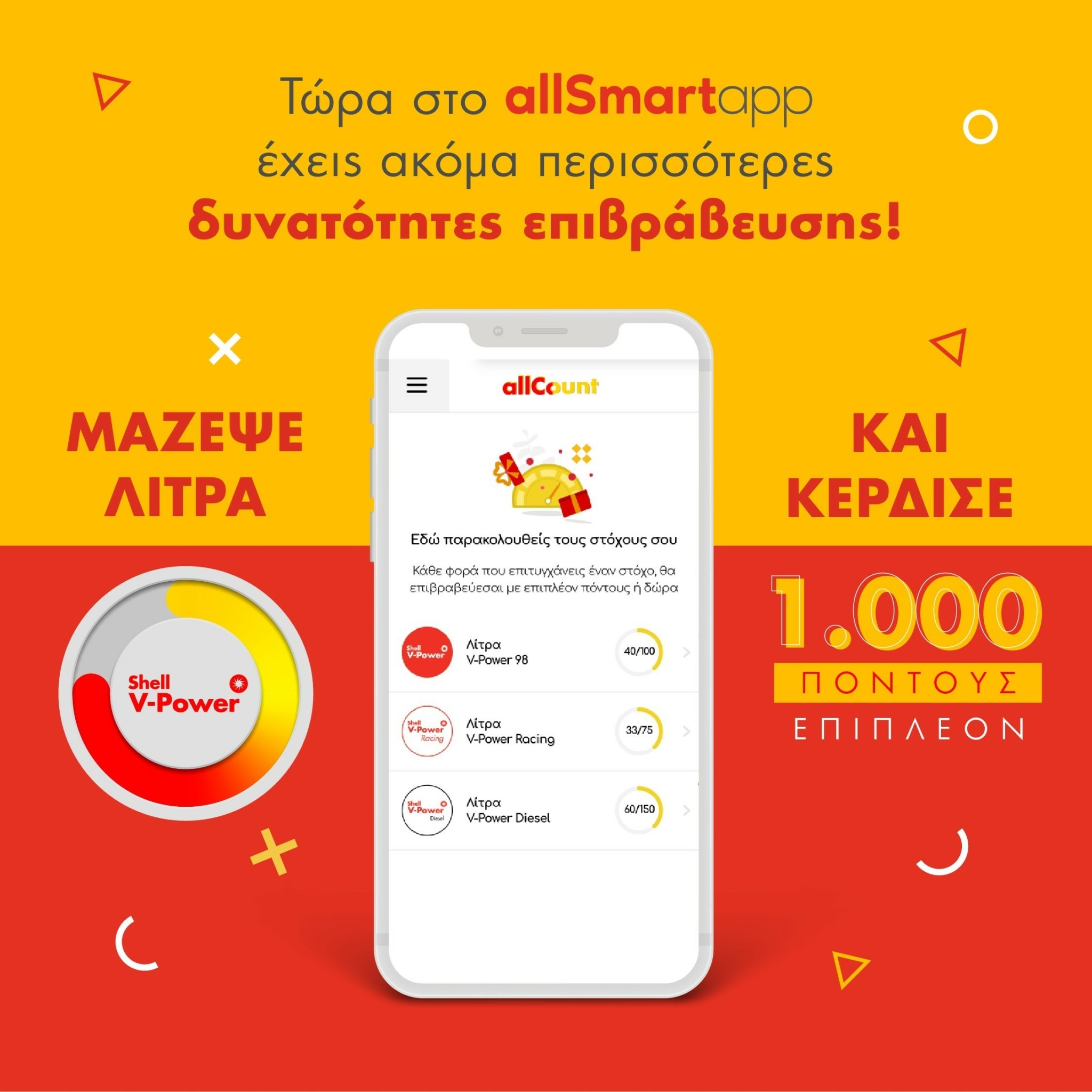 Mε αυτή την προσφορά των νέων και βελτιωμένων καυσίμων Shell V-Power, τα μέλη του allSmart μπορούν, μέσω του allCount, να αυξήσουν τους διαθέσιμους πόντους τους και να έρθουν πιο γρήγορα κοντά στα δώρα που επιθυμούν από το e-shop allSmart.gr ή τον κατάλογο δώρων του allSmart στα πρατήρια Shell.