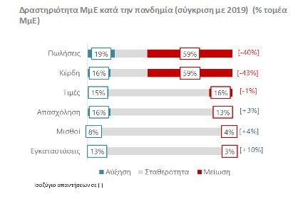 Αντίστοιχη πορεία ακολούθησαν τα κέρδη των ΜμΕ (καθαρό ισοζύγιο -43% του τομέα). Αντίθετα, διαθρωτικά μεγέθη όπως η απασχόληση και οι πάγιες εγκαταστάσεις παρέμειναν σχετικά σταθερά για την πλειοψηφία του τομέα (με οριακά θετικό καθαρό ισοζύγιο απαντήσεων). Τα παραπάνω δεδομένα, σε συνδυασμό με την επιλογή των ΜμΕ να μην προσαρμόσουν τις τιμές τους στη χαμηλότερη ζήτηση που αντιμετώπισαν κατά τη διάρκεια της πανδημίας, υποδηλώνει ότι οι ΜμΕ εξέλαβαν την πανδημία ως μια συγκυριακή διαταραχή, που δεν ανατρέπει τη μακροπρόθεσμη στρατηγική τους.
