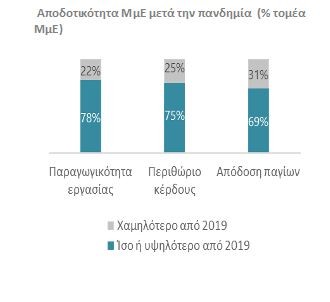 Η παραπάνω διαπίστωση επιβεβαιώνεται περαιτέρω από το γεγονός πως μετά το πέρας της πανδημίας οι ΜμΕ αναμένουν υψηλότερες πωλήσεις και κερδοφορία σε σχέση με το 2019 (+20% και +5% αντίστοιχα σε όρους καθαρού ισοζυγίου απαντήσεων), ενώ σχεδιάζουν την περαιτέρω ανάπτυξη τους, τόσο όσον αφορά την απασχόληση (+11%) όσο και την επέκταση των πάγιων εγκαταστάσεών τους (+14%). Αντίστοιχα, ως προσωρινή εκλαμβάνεται η αρνητική διαταραχή στην παραγωγικότητα της εργασίας και στην απόδοση των παγίων τους. Συγκεκριμένα, όσον αφορά την παραγωγικότητα της εργασίας, ενώ κατά τη διάρκεια της πανδημίας μειώθηκε για το 45% των επιχειρήσεων, το 79% των ΜμΕ θεωρεί πως με το πέρας της πανδημίας η παραγωγικότητα της εργασίας θα είναι ίδια ή και υψηλότερη από τα επίπεδα του 2019.