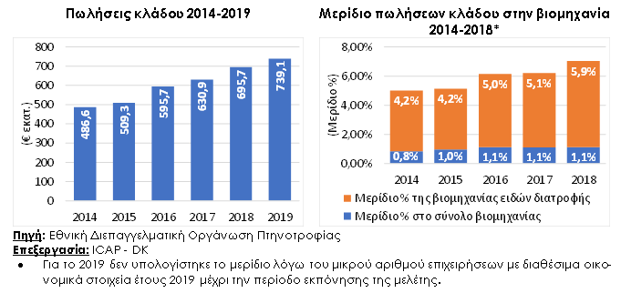 Ο μέσος ετήσιος ρυθμός μεταβολής πωλήσεων την περίοδο 2014-2019 διαμορφώθηκε σε 8,8%. Ο κλάδος έχει αξιόλογη παρουσία στο σύνολο της εγχώριας βιομηχανίας καλύπτοντας ανερχόμενο μερίδιο στις συνολικές πωλήσεις το οποίο το 2018 ανήλθε σε 1,1%. Παράλληλα το μερίδιο του κλάδου στο σύνολο πωλήσεων των βιομηχανιών ειδών διατροφής διαμορφώθηκε το 2018 σε 5,9%.