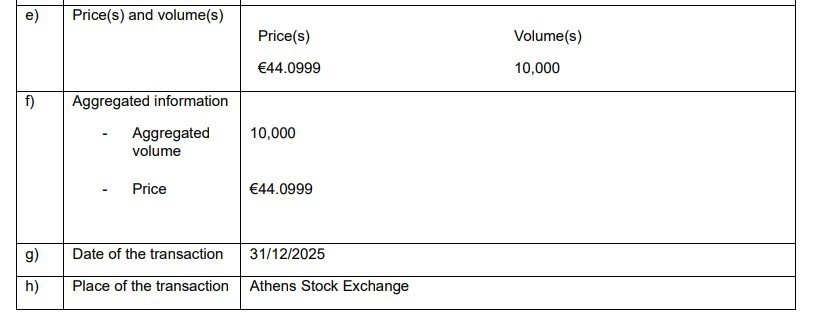 Η συναλλαγή πραγματοποιήθηκε στο Χρηματιστήριο Αθηνών σε τιμή €44,0999 ανά μετοχή. Η ανακοίνωση επιβεβαιώνει τη διαδικασία που προβλέπεται από το άρθρο 19 του Κανονισμού Market Abuse Regulation, διασφαλίζοντας πλήρη ενημέρωση της αγοράς σχετικά με τις κινήσεις μετοχών από στενά συνδεδεμένα πρόσωπα.