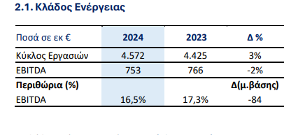 Ο Κλάδος Ενέργειας κατέγραψε κύκλο εργασιών €4.572 εκατ. που αντιστοιχεί σε 81% του συνολικού κύκλου εργασιών, παραμένοντας στα ίδια επίπεδα σε σχέση με το 2023. Τα Κέρδη προ Φόρων, Τόκων και Αποσβέσεων (EBITDA), διαμορφώθηκαν στα €753 εκατ. μειωμένα κατά 2% έναντι €766 εκατ. το 2023. Οι επιδόσεις αυτές, πρέπει να υπογραμμιστεί ότι επιτεύχθηκαν με τιμές Φ.Α. κατά 16% χαμηλότερες σε σχέση με το 2023