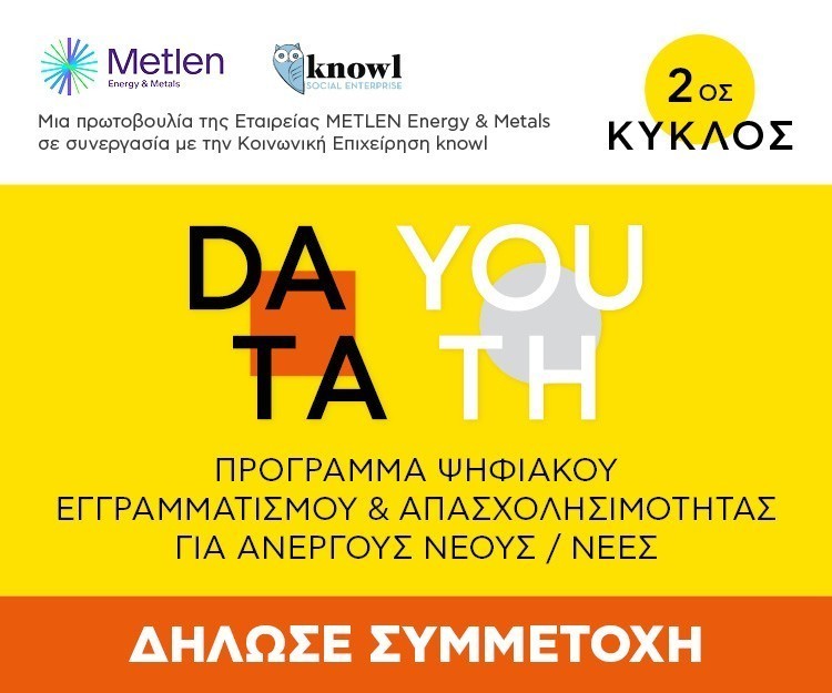 Η METLEN Energy & Metals και η knowl ανακοινώνουν την έναρξη του 2ου κύκλου του Data Youth, ενός καινοτόμου προγράμματος που ενισχύει τον ψηφιακό εγγραμματισμό και την απασχολησιμότητα ανέργων νέων 18-35 ετών.