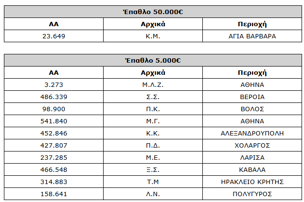 Οι νικητές της κλήρωσης προέρχονται από περιοχές ολόκληρης της Ελλάδας και, πιο συγκεκριμένα, αναδείχθηκαν οι κάτωθι νικητές για τα έπαθλα των 50.000€ & 5.000€ *: