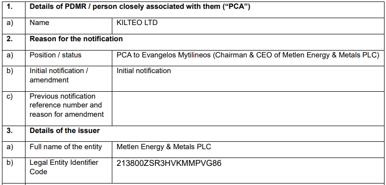 Η Metlen Energy & Metals PLC γνωστοποίησε νέα συναλλαγή υπόχρεου προσώπου (PDMR), στο πλαίσιο των υποχρεώσεων διαφάνειας που απορρέουν από την ευρωπαϊκή και βρετανική νομοθεσία.