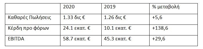 Σύμφωνα με τις οικονομικές καταστάσεις που δημοσιοποίησε σήμερα η εταιρεία, οι καθαρές πωλήσεις παρουσίασαν αύξηση 5,6% φθάνοντας το 1,33 δις ευρώ. Παράλληλα τα κέρδη προ φόρων αποσβέσεων και τόκων (EBITDA) ανήλθαν σε 58.7 εκατ. ευρώ, έναντι 45.3 εκατ. ευρώ το 2019 (αύξηση 29,6%). Τα κέρδη προ φόρων ανήλθαν σε 24.1 εκατ. ευρώ έναντι 10.1 εκατ. ευρώ το προηγούμενο έτος. Το 2020 έκλεισε με καθαρές πωλήσεις ύψους 1.33 δις ευρώ, έναντι 1.26 δις ευρώ το 2019 (αύξηση κατά 5,6%).