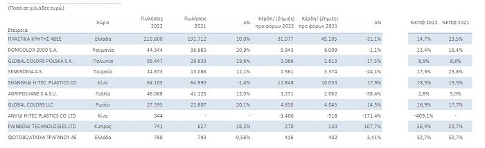 Για φέτος η διοίκηση της εισηγμένης αναμένει καλύτερη επίδοση σε σχέση με πέρυσι, χωρίς ωστόσο να πλησιάσει το «εξαιρετικό επίπεδο» του 2021 σε επίπεδο κερδοφορίας, όπως το είχε χαρακτηρίσει. Σημειώνεται πως το 2022 ο Όμιλος είχε αύξηση πωλήσεων στα 416,2 εκατ. ευρώ (από 374,8 εκατ. ευρώ το 2021), αλλά μείωση EBITDA στα 69,5 εκατ. ευρώ (από 74,78 εκατ. ευρώ) και καθαρών κερδών στα 44,1 εκατ. ευρώ (από 53,17 εκατ. ευρώ).