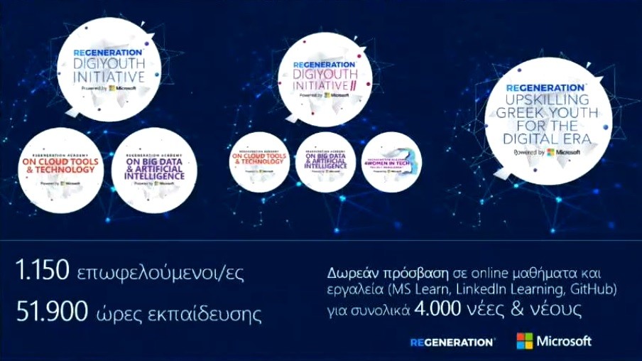 Η πολύ επιτυχημένη συνεργασία στην πρωτοβουλία ReGeneration DiGiYouth Initiative Ι & ΙΙ powered by Microsoft, οδήγησε στο σχεδιασμό του “The ReGeneration Initiative: Upskilling Greek Youth for the Digital Era powered by Microsoft”, ενός νέου και πιο διευρυμένου up/reskilling προγράμματος για τους νέους της χώρας μας, που εστιάζει στις περιζήτητες ψηφιακές δεξιότητες που είναι απαραίτητες για το μέλλον της εργασίας. Η εν λόγω πρωτοβουλία πρόκειται να ωφελήσει 1.000 νέες και νέους παρέχοντας περίπου 20.000 ώρες εκπαίδευσης σε ήπιες και ψηφιακές δεξιότητες (πχ office automation, mobile apps, information systems, data visualization, cloud technologies, digital marketing, UI/UX, κλπ.), με άμεση δικτύωση σε περισσότερες από 1.300 εταιρείες πανελλαδικώς που συνεργάζονται με το ReGeneration.